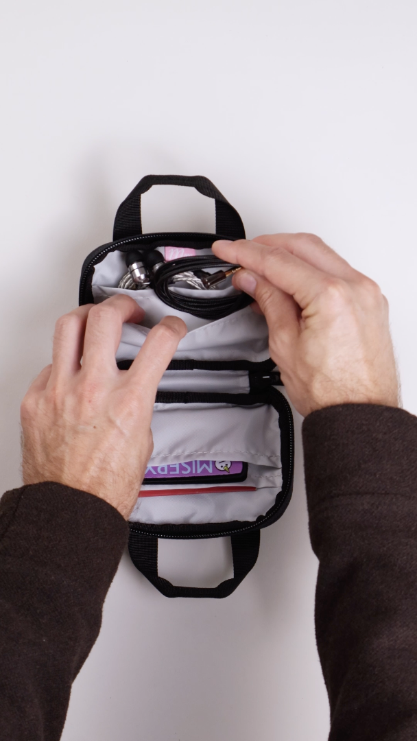 The Essentials Pouch features a fully-clamshell zipper compartment with 4 slip pockets. The back includes a spring clamp for attaching the cross-body strap or for clipping however you see fit.